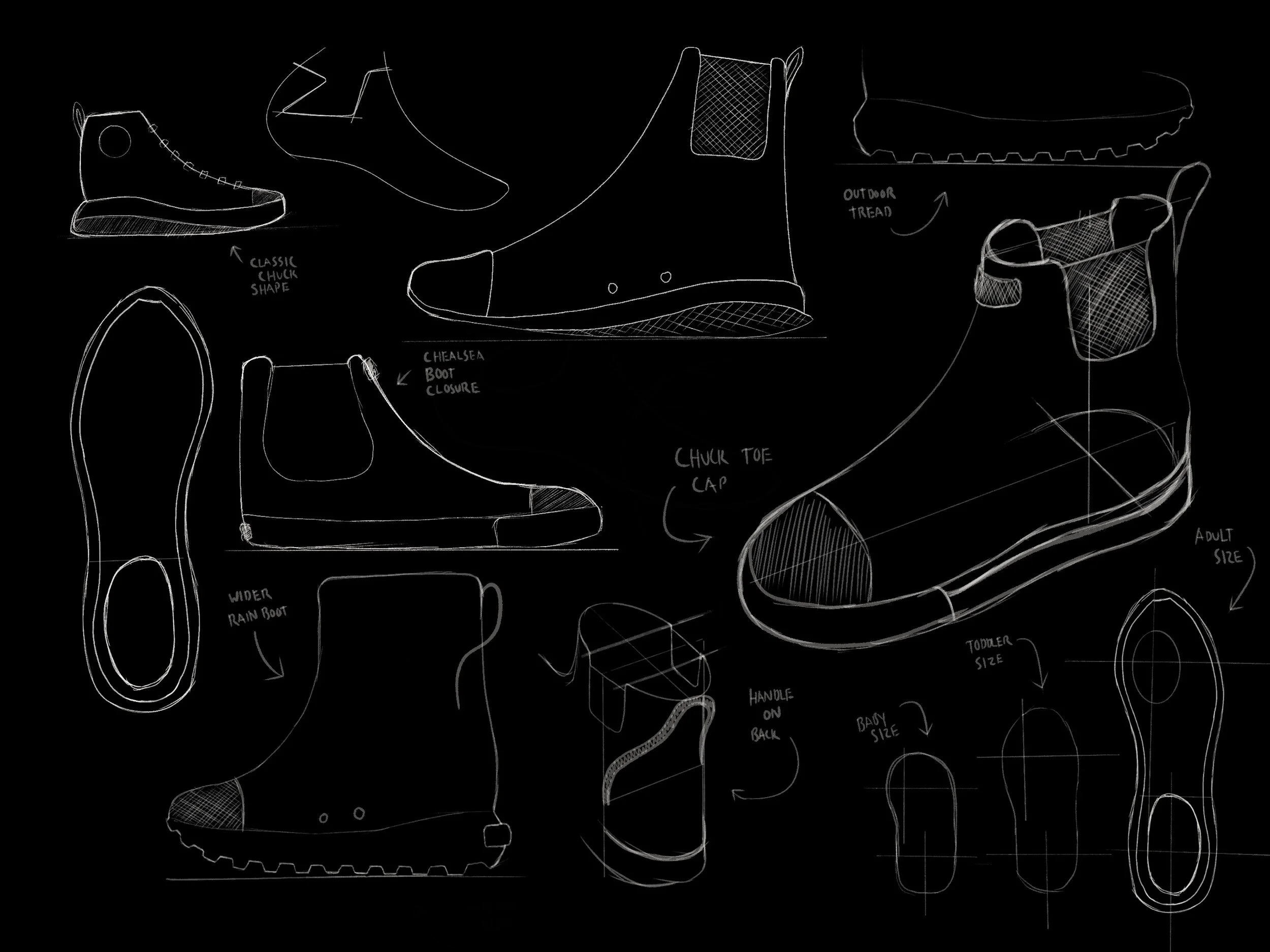 During the brainstorming process, one of the ideas that I returned to was how tricky it can be for kids to put on their rain boots. I had this image in my head of a parent trying to calm down a squirming child, trying to help them tie up their shoes, while the kid is already looking out the windows for the biggest puddle. I decided to narrow my focus slightly and create a rain boot that was easy and fast for kids to put on that also kept water out, and fit in with Converse’s design language.